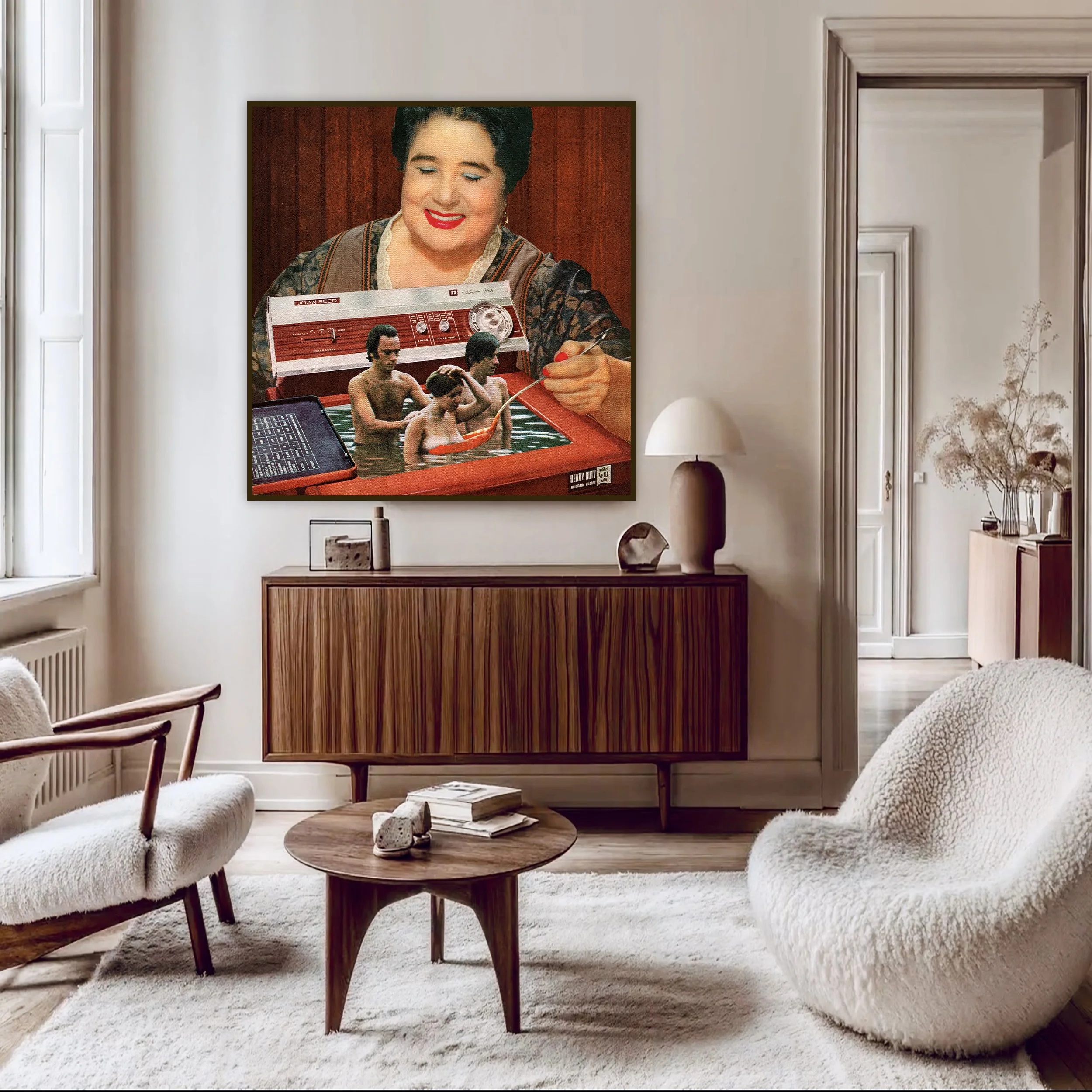 ‘Under Cover’ is a retro-futurist political collage that explores the hidden machinery behind glamor and spectacle. A beautiful woman’s face is revealed as a cover for a secret technological operation, while political leaders wave in the background of a burning city. The work critiques surveillance, propaganda, and the seductive illusions of power.